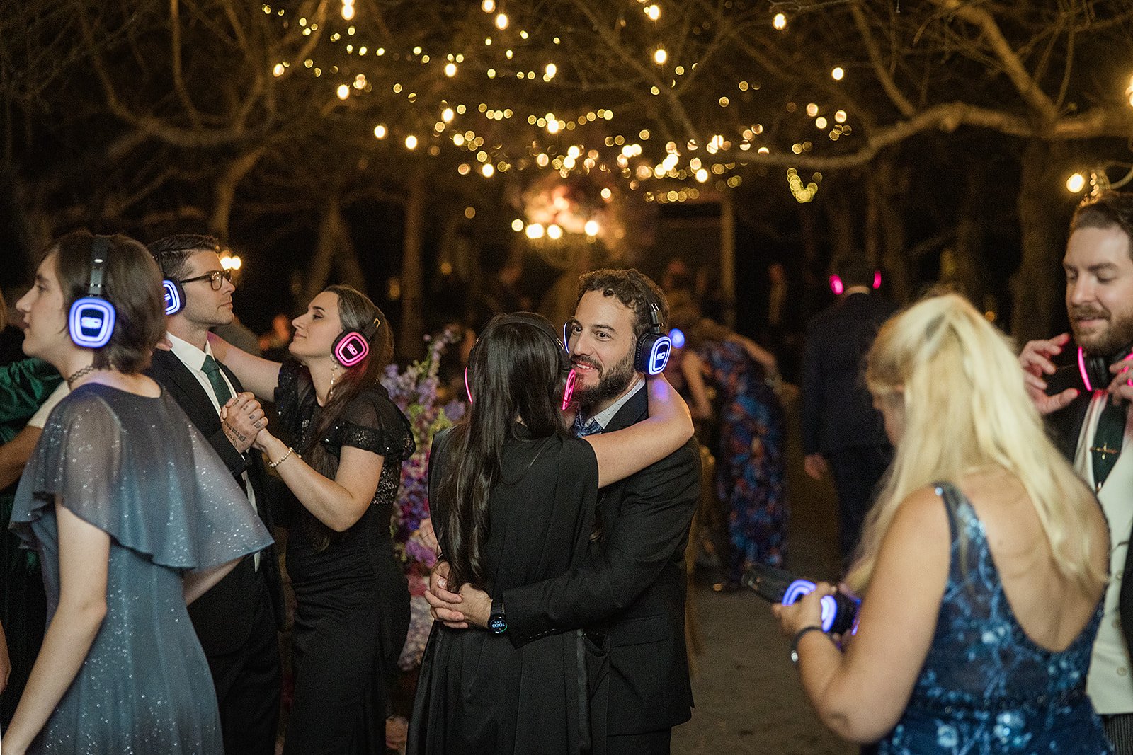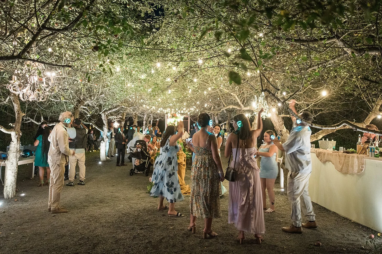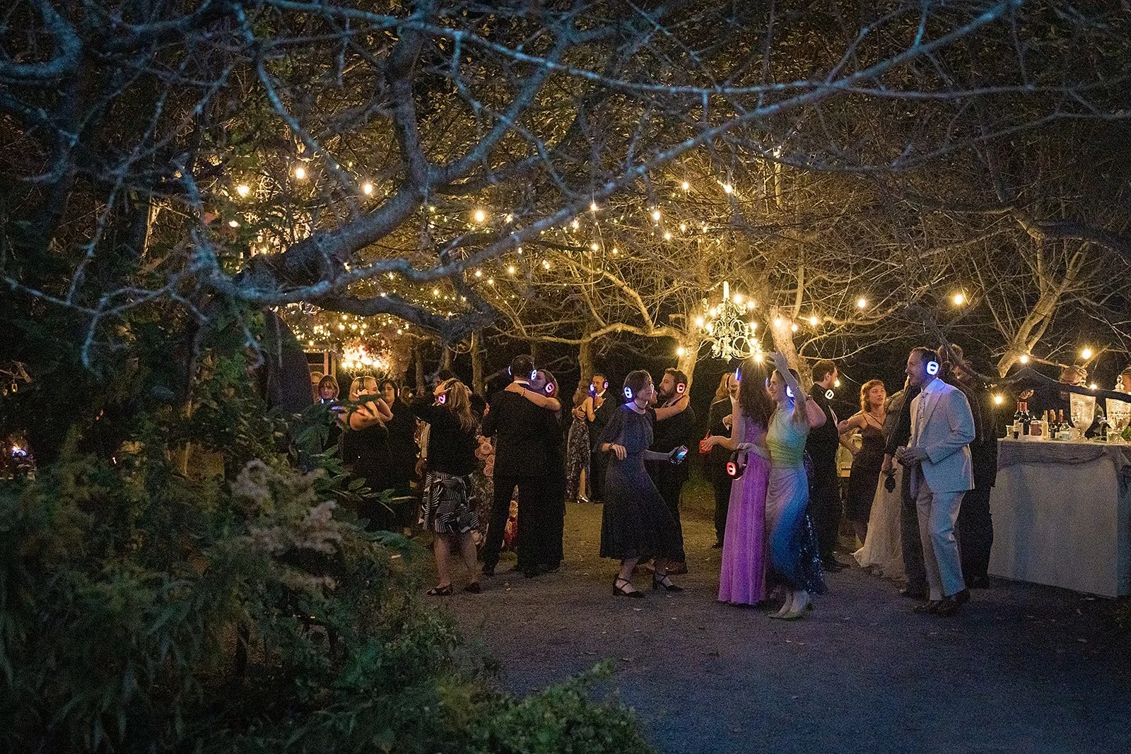 It’s a modern garden party thats starts in the Enchanted Orchard where we serve the pre-lit headsets to guests from our large antique silver trays. We explain what genre of music is playing from each particular color on headset and how to change channel and adjust volume. It’ all very personalized and with our dedicated team it takes mere minutes to distribute the high-end professional-grade, comfortable headsets You might have: