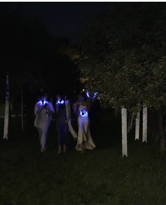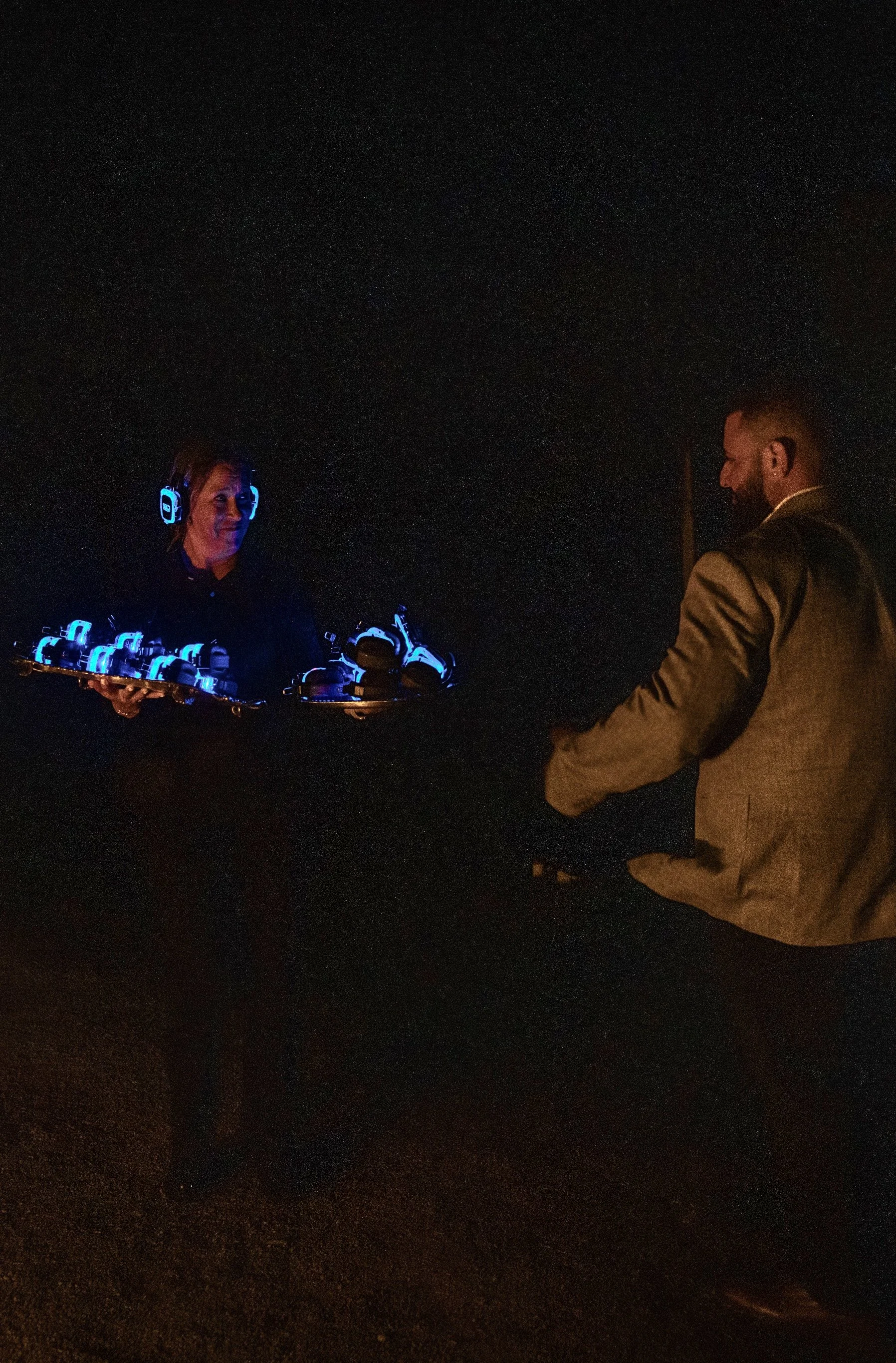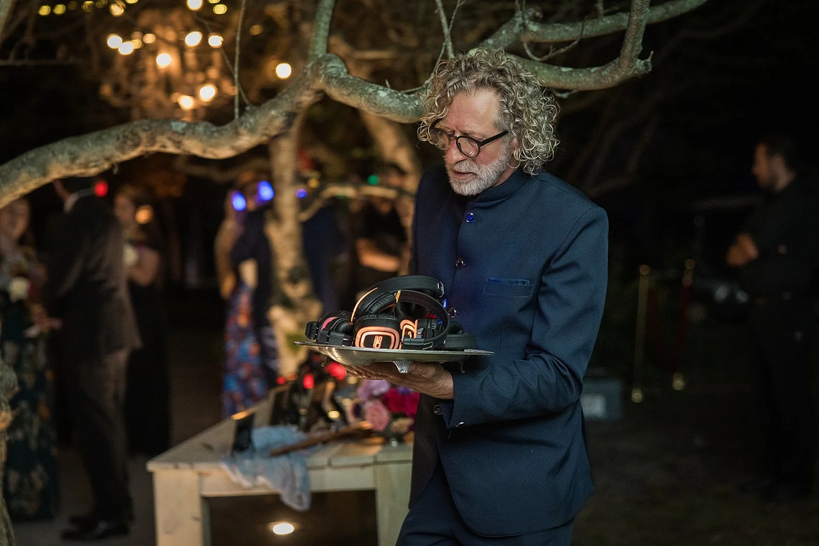 It’s a modern garden party thats starts in the Enchanted Orchard where we serve the pre-lit headsets to guests from our large antique silver trays. We explain what genre of music is playing from each particular color on headset and how to change channel and adjust volume. It’ all very personalized and with our dedicated team it takes mere minutes to distribute the high-end professional-grade, comfortable headsets You might have:
